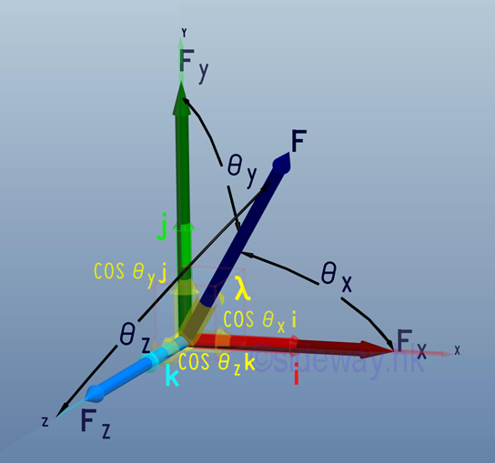 And the values of direction consines or the angles are not independent. The force vector, F can also be expressed in terms of unit coordinate vectors and direction cosines as following:
