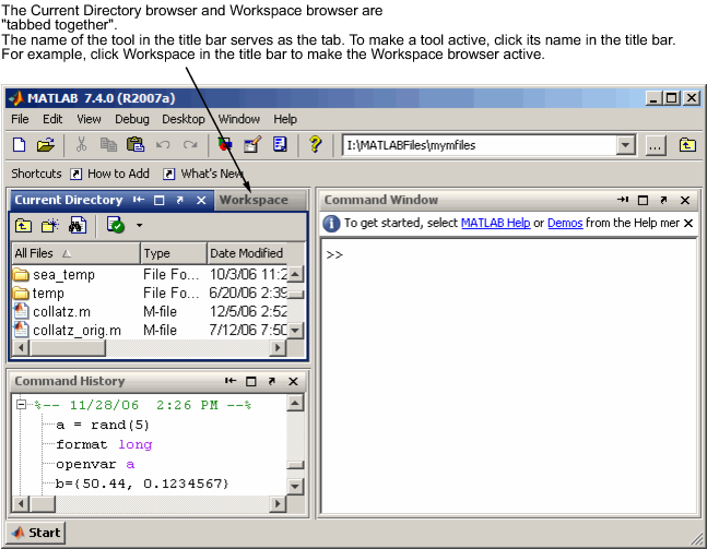Since MatLab provides an interactive computing environment, besides programming and scripts, interactive computing is also available in command mode for immediate evaluation. Start MatLabIn general, the MatLab can be started by double-click the MatLab shortcut or click the MatLab icon Basic DesktopThe graphical user interface of the desktop of MatLab provides panels and desktop interface for interacting with MatLab. For example: