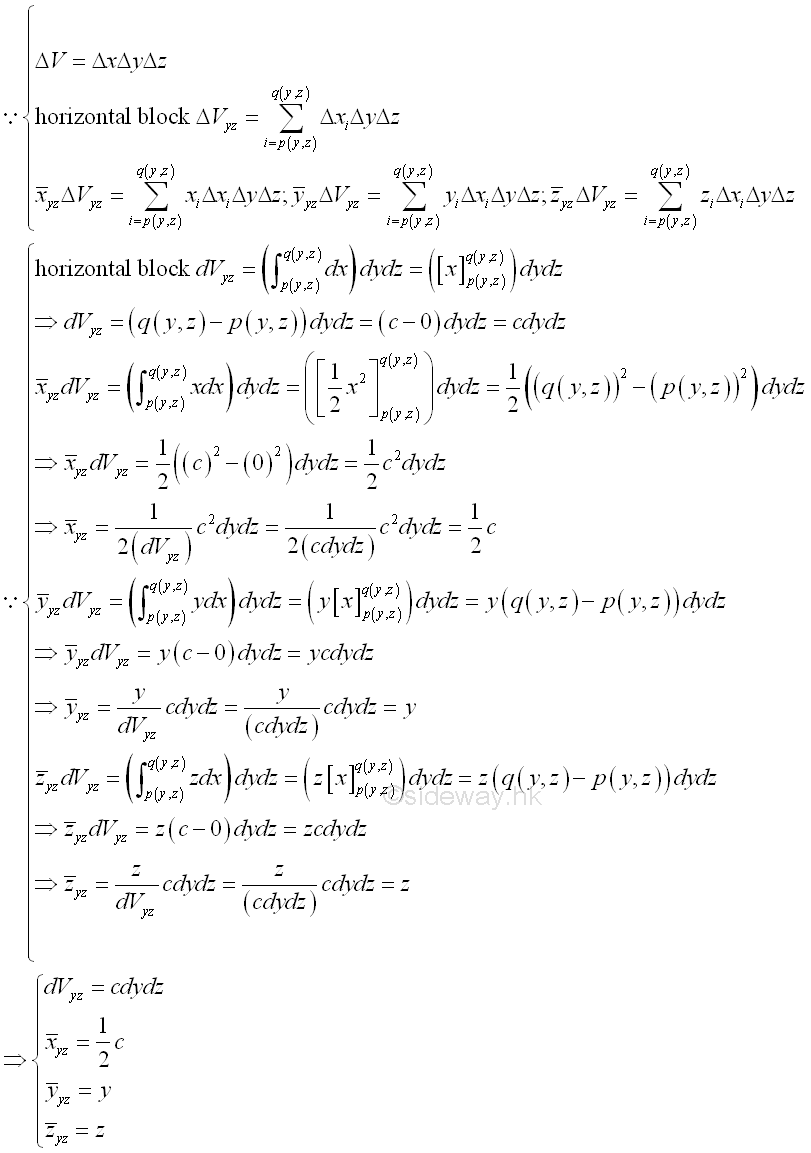 After the grouping of unit elemental volumes into one elemental volume, the coordinates of the centroid of a volume can also be determined by double integration in a similar way by considering the centroid of each elemental volume block. Imply