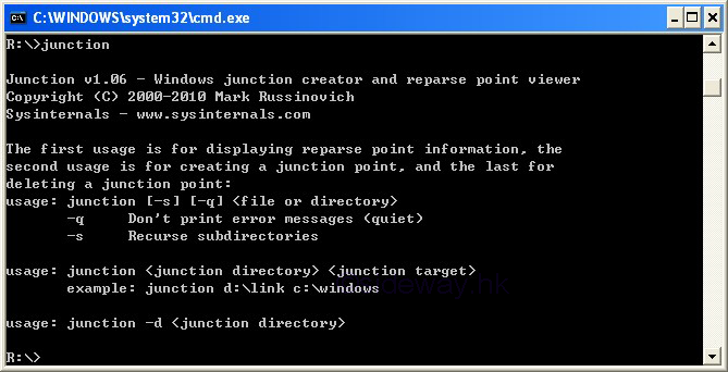 Sysinternals JunctionSysinternals Junction is command-line utility software from Sysinternals to create or manipulate symbolic links. The interfacee of Junction from sysinternals: