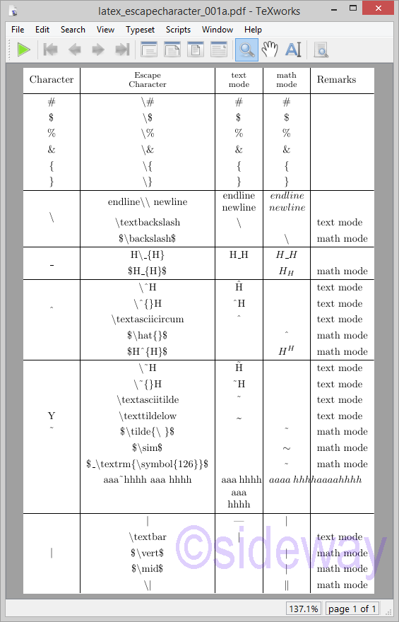 Character&\thead{Escape\\Character}&\thead{text\\mode} &\thead{math\\ mode}&Remarks\\