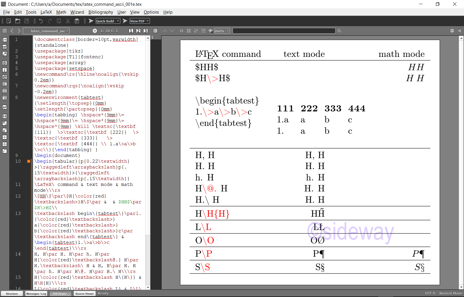 HH\par H{\color{red}\textbackslash,}H & HH\par H\,H & $HH$\par$H\,H$\\\rs